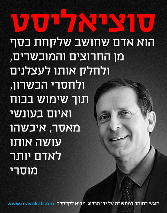 ספציפית במדינת ישראל, השמאל מנצל את המצוקה שהציבור נקלע אליה בעקבות המשבר הכלכלי העולמי, על מנת להוביל אותו מן הפח אל הפחת. אם למעמד הביניים קשה להתקיים כיום, תארו לעצמכם עד כמה יהיה קשה לו לאחר שבוז'י הרצוג יממש את תוכניתו להרחיב את ההוצאה הממשלתית ולממן זאת באמצעות הגדלת הגירעון והעלאת מסים. הרצוג טוען שהוא יוזיל את מחירי הדיור, אולם בד בבד הוא מתכנן לסגת לקווי 67', תוך כדי עקירת מאות אלפי משפחות המתגוררות ביהודה ובשומרון. אם תוכנית זו תמומש, והממשלה תצטרך למצוא פתרונות דיור לכמות כה עצומה של אנשים, מחירי הדיור לא רק שלא ירדו אלא צפויים להרקיע שחקים. לפיכך אני קורא לכולם לא לקנות את התופינים המורעלים שהרצוג מנסה למכור לנו. אם קשה לכם כמוני להתפרנס ולהגיע לרכישת דירה, סוציאליזם איננו הפתרון. הפתרון הוא בהעלאת הריבית, המשך הפחתת המסים, צימצום ההוצאה הממשלתית וקיצוץ בבירוקרטיה – בקיצור, כל הצעדים שהם המדיניות המוצהרת של הימין.