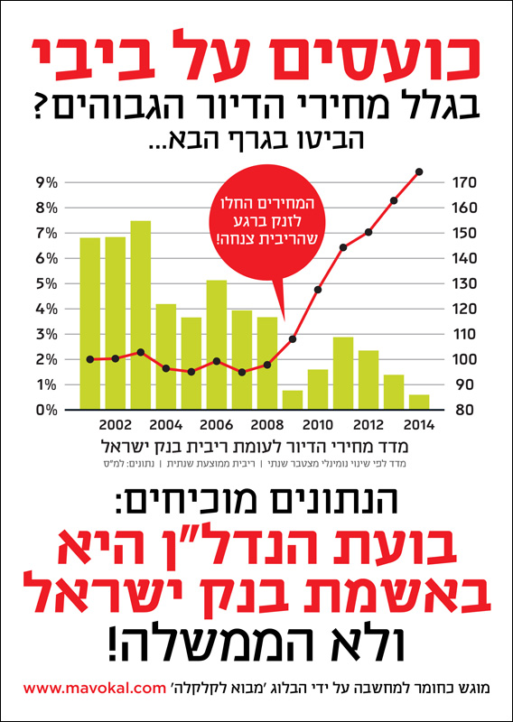 אם ישנו גרף אחד בלבד שאתם צריכים לראות לפני שתחליטו למי להצביע בבחירות הקרובות – זהו הגרף. אזרחים רבים במדינת ישראל, אשר רואים כיצד חלום הדירה משלהם הולך ומתרחק מהם בשנים האחרונות, מפנים את זעמם כלפי הממשלה. הם סבורים שאם מחירי הדירות טיפסו באופן כה שערורייתי זה באשמתו של בנימין נתניהו, ושרק החלפתו תפתור את הבעיה. ובכן, המציאות שונה בתכלית. התבוננות בגרף המשווה את מדד מחירי הדיור לעומת ריבית בנק ישראל מדגים כיצד מחירי הדיור החלו לזנק בדיוק ברגע שבנק ישראל הוריד את הריבית לשיעורים נמוכים באופן היסטורי. היות ובנק ישראל הוא גוף עצמאי אשר קובע את מדיניות הריבית לבדו, האשמה בניפוח בועת הנדל"ן רובצת על כתפיו, ולא על כתפי הממשלה.