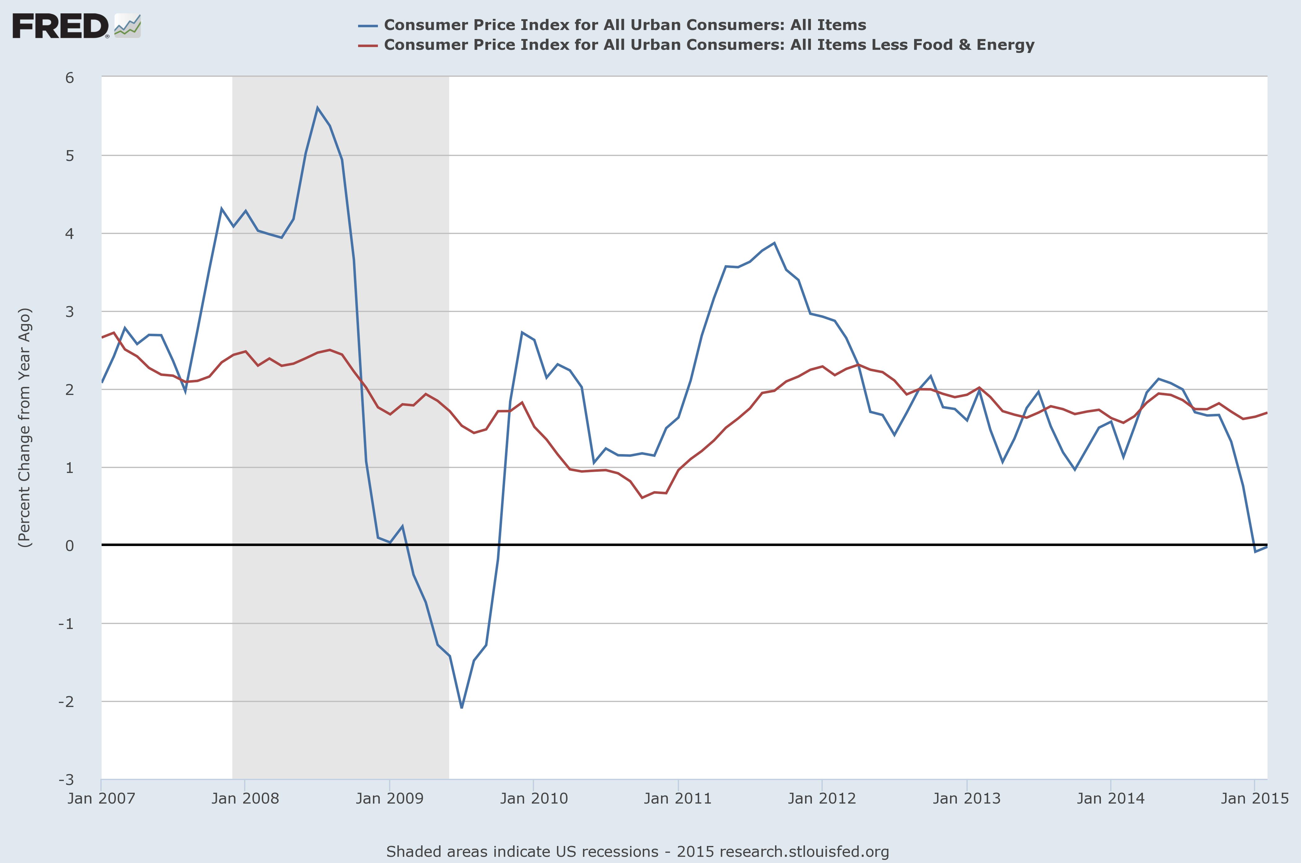 מה עשה בינתיים מדד המחירים לצרכן? ובכן, לא יותר מדי. זה נכון שמדד המחירים לצרכן הכללי בארה"ב צנח בחודשים האחרונים ונגע פעם נוספת ברמה האפסית שכמותה ראינו בשיא המשבר, אולם שינוי זה נובע אך ורק בגלל הירידה העולמית במחיר הנפט. אנחנו רואים שמה שמכונה "מדד הליבה" (ללא מזון ודלק) נשאר פחות או יותר יציב כבר שלוש שנים, ועומד על רמה סבירה של בין 1% ל-2%. לכאורה, התפרצות אינפלציונית איננה נראית באופק. אולם בו זמנית עלינו לקחת בחשבון שהדולר התחזק מאוד בחודשים האחרונים (בלמעלה מ-20 אחוזים!) ביחס לשאר המטבעות, מה שמפעיל לחץ חזק על המחירים בארה"ב לרדת (היות וארה"ב מייבאת את מרבית מוצרי הצריכה שלה). עצם העובדה שלמעט דלק המחירים בארה"ב אינם יורדים מעידה כאלף עדים על הלחצים האינפלציונים החזקים אשר רוחשים מתחת לפני השטח.