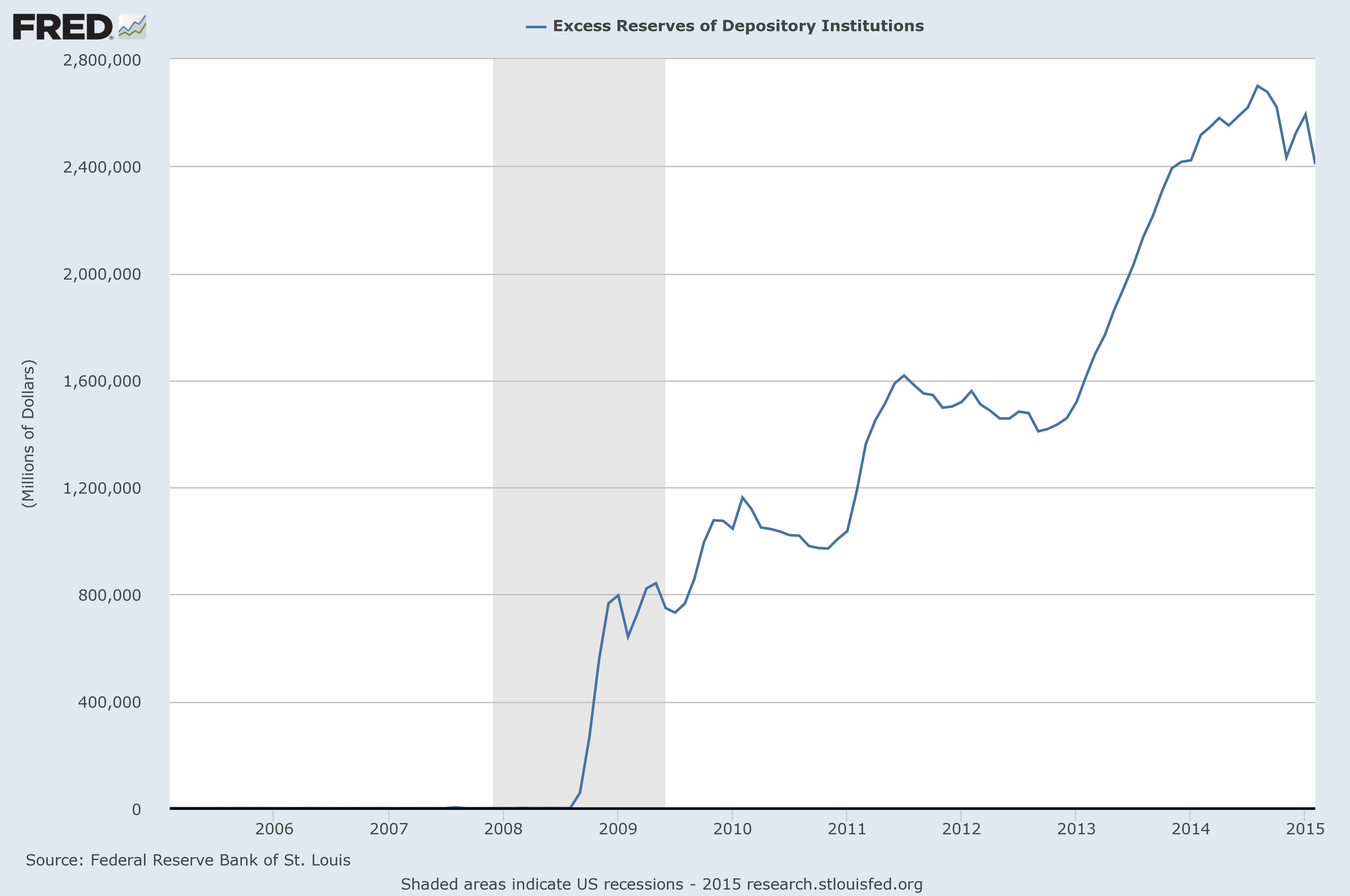 הגרף הראשון מציג את מימדי הבעיה. אלו הם הקפי הרזרבות העודפות שהבנקים השונים בארה"ב מחזיקים בחשבונותיהם בבנק המרכזי. במצב נורמלי הרזרבות הללו אמורות להיות אפס, היות והבנקים מעוניינים להלוות ללקוחותיהם את כל ההון שנמצא ברשותם. אולם עקב המצב המיוחד שנוצר בשנת 2008 הביקוש לאשראי צנח באופן דרמטי, והבנקים עצמם לא היו נלהבים לחלק הלוואות חדשות. במקביל, החל הפד לרכוש מבנקי ההשקעות את כל המשכנתאות ה"רעילות" שאותן החזיקו במאזנים שלהם, ובתמורה העניק להם כסף חדש שנוצר יש מאין. באופן כזה תפחו בהדרגה הרזרבות העודפות של הבנקים, עד שהגיעו באוגוסט 2014 לסכום האגדי של 2.7 טריליון דולר. אנחנו רואים שמאז הן דעכו במקצת, עד שכיום הן עומדות על 2.4 טריליון דולר, אולם החלק הארי של הכסף עדיין תקוע "מאחורי הסכר", במאזנים של הבנקים.