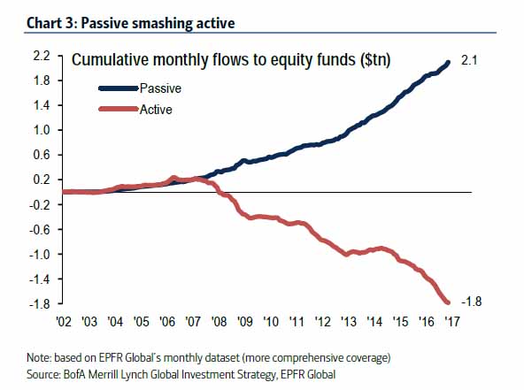 מה עשה הציבור בתגובה? במקום להפחית את החשיפה שלו למניות, הציבור הסתער עליהן בהתלהבות. מאז תחילת 2017 הושקעו במניות ברחבי העולם למעלה מ-80 מיליארד דולר. הרוב המוחץ של הכסף הזה הושקע בתעודות סל "טיפשות", אשר אינן מנוהלות באופן אקטיבי ופשוט עוקבות אחרי מדדי המניות. יש לציין שתעודות סל אלו הן מכשיר השקעה נוח וזול, היות והעמלות שלהן נמוכות בהרבה בהשוואה לקרנות המנוהלות. אולם הן הופכות את שוק ההון ליותר ויותר פגיע, היות ובזמן מפולת המחזיקים בהן מוכרים את כל סוגי המניות בו זמנית, וללא הבחנה בין הסקטורים השונים. אסטרטגיית ההשקעה הפאסיבית, אשר מתמקדת בהפחתת העלויות, היא מאפיין ידוע של שוק שורי וותיק אשר קרב לקיצו. לאחר שנים רצופות של עליות במדדים המשקיעים נעשים שאננים, ומוכנים לוותר על שירותיהם של המנהלים המקצועיים, על מנת לחסוך בעמלות. החלטה זו צפויה להתנקם בהם במידה והשוק ישנה כיוון. הנסיון מראה שמשקיעים חובבניים לעולם לא מסוגלים לזהות את השיא. הם תמיד נשארים מושקעים הרבה אחרי שה"כסף החכם" כבר יצא החוצה. הם יזכרו למכור רק אחרי שהשוק כבר ירד עשרים או שלושים אחוזים, והעקשניים שביניהם ישברו רק כשהשוק יגיע לתחתית.