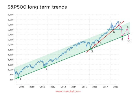 מה יקרה לאחר מכן? ובכן, במידה ומדד ה-S&P500 אכן ימצא תמיכה בקו המגמה העולה ארוך הטווח, הוא צפוי לשוב ולטפס כאילו שום דבר לא קרה. העליות החדות אשר אנו צפויים לחוות בשלב זה יאוששו את אמונתם של השוורים באיתנותו של שוק ההון. חלק מן האנשים אשר נטשו את המניות בימים האחרונים עלולים לחשוב שזוהי הזדמנות נהדרת לשוב ולהיכנס פנימה, בנקודת מחיר נמוכה יותר. אולם אם אכן שוק המניות ״שבור״ כפי שאני סבור (ומסקנה זו אני מסיק מן הניתוח הפונדמנטלי ולא מן הניתוח הטכני), הרי שמדד ה-S&P500 לא יצליח לשחזר את השיאים האחרונים שלו (נקודה 9 בגרף), וכי הירידות ישובו ויתחדשו במהלך שנת 2019.