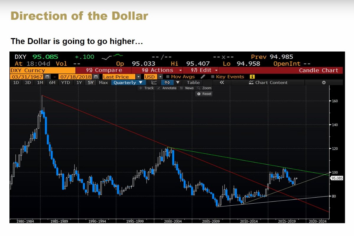 הגרף שהוא מציג על מנת לתמוך בטענתו מראה כי הדולר פרץ בשנת 2014 קו מגמה יורד ארוך טווח, המתמשך מן השיא של כל הזמנים בשנת 1985. מאז הוא שרוי בתצורת ״דגל״ (Pennant), אשר קו המגמה שהצגתי בגרף הקודם מהווה את הקצה התחתון שלה, ומבטאת חוסר החלטה. אם נראה בחודשים הקרובים את אינדקס הדולר שובר את הדגל הזה כלפי מטה, נדע שהוא צפוי להיחלש מאוד, עד לאזור ה-80 נקודות. מצד שני אם יצליח להשתקם ולחצות את קו ה-100, נדע שאין שום התנגדות מהותית בינו ובין 120 נקודות. יש לציין שאני אישית לא השתכנעתי בנכונות התיאוריה הזו, אך לנוכח חוזקתו של הדולר גם לא ביטלתי אותה כלאחר יד. אני חושב ש״תיאוריית המילקשייק״ עומדת בעינה כל עוד שוק המניות של ארה״ב שובר שיאים. אך אם וכאשר הוא יקלע לשוק דובי אמיתי, כל המילקשייק ישפך על הרצפה…