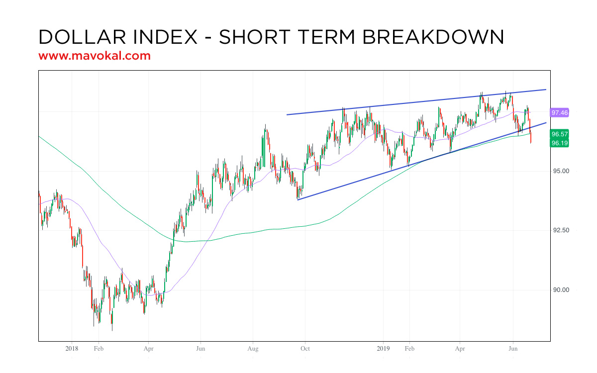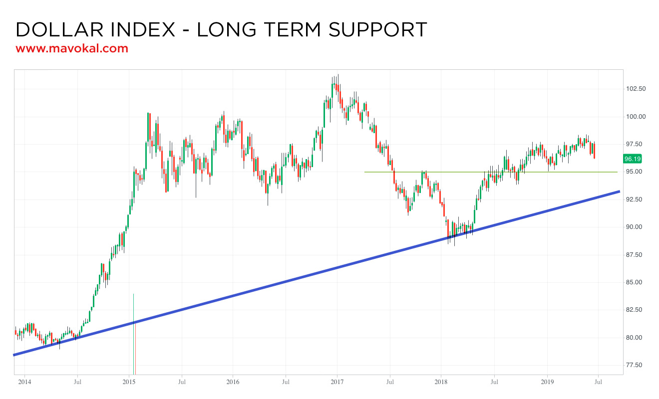 על מנת לנסות ולזהות את הרגע שבו ההיפוך הזה יתרחש, אני עוקב אחר מה שמכונה ״אינדקס הדולר״ (שסימנו DXY). שימו לב, אין מדובר במדד אשר משווה את הדולר לשקל הישראלי, אלא לסל מטבעות בינלאומיים ובראשם האירו. התמקדות בדולר ביחס לשקל עלולה להיות מטעה, משום שהדולר עלול להתחזק ביחס לשקל, בעודו מאבד מערכו ביחס לכל שאר המטבעות (שבמקרה כזה השקל מאבד ערך אף יותר מהר מן הדולר). ובכן, ביום שישי האחרון אינדקס הדולר שבר קו מגמה עולה אשר החל במהלך 2018. בו זמנית הוא גם נם נפל מן הממוצע הנע של 200 הימים, מה שמהווה אינדיקטור שלילי בטווח הקצר.