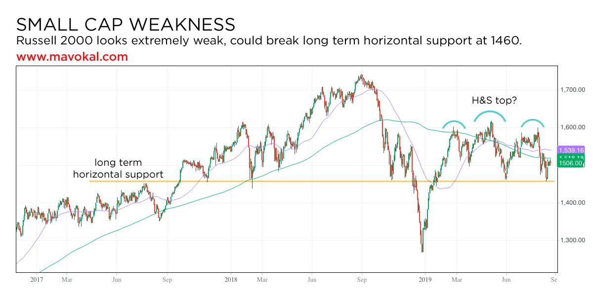 לפני שניפרד, אני רוצה להראות לכם את הגרף של ה-Russell 2000. זהו מדד של אלפיים המניות הקטנות בבורסה של ניו-יורק. אף על פי שהוא מכיל הרבה יותר חברות מאשר מדד ה-S&P500, שווי השוק שלו הרבה יותר קטן. זוהי תופעת לוואי של המגמה בשנים האחרונות להשקיע באמצעות תעודות סל וקרנות מחקות למיניהן. המשקיעים שמים את כספם בתור ברירת מחדל במדדים המובילים, והמניות שנמצאות מחוץ למדדים אלו אינן נהנות מכך. החברות במדד Russell 2000 הן בדרך כלל חברות אמריקאיות מקומיות, שאינן מנהלות עסקים ברמה בינלאומית. לפיכך הן לדעתי מספקות תמונה יותר מהימנה לגבי מצב הכלכלה האמריקאית. ובכן, מדד זה נראה פשוט איום ונורא. הוא הגיע לשיא שלו בספטמבר 2018, ומאז לא הצליח להתקרב לשם. הוא שרוי כעת מתחת לממוצע הנע של 200 הימים, ונראה כעומד לשבור רמת תמיכה אופקית באזור 1460 נקודות, אשר תמכה בו מזה שנתיים. אם מדד זה מעיד במשהו על הכיוון הכללי של הבורסה, זה אינו מעודד כלל.