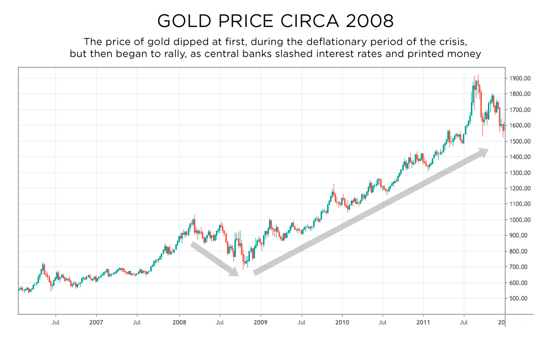 זוהי איננה ספקולציה פרועה מצידי. שהרי התסריט הזה ממש כבר התרחש בשנת 2008. להזכירכם, ערב פרוץ משבר הסאב-פריים, מחיר הזהב עמד על כ-1000 דולר לאונקיה. היה זה בזמנו שיא של כל הזמנים, אשר הושג בתום ראלי שנמשך שבע שנים. לפיכך סוחרים רבים בוול-סטריט החזיקו בזהב, לאו דווקא משום שהם הבינו מדוע מחירו מטפס, אלא פשוט משום שהם רדפו אחר המומנטום. כאשר המשבר היכה, מחיר הזהב צנח עד לשפל של 700 דולרים באוקטובר של אותה השנה. הייתה זו כמובן טראומה נוראית עבור אותם משקיעים אשר האמינו שהזהב יגן עליהם בפני הסערה, וחלקם אף עשה את הטעות ומכר את הזהב שלו בתחתית. אך זמן קצר לאחר מכן הפדרל רזרב פצח בתוכנית ההקלה הכמותית הראשונה שלו, והממשל הפדרלי החל לבזבז כספים כמו מלח שיכור (דבר מה שתיארתי בפרוטרוט במאמר הזה). הביקוש המוניטרי לזהב גבר, והכריע עד מהרה את הירידה בביקוש התעשייתי. כתוצאה מכך מחיר הזהב שינה כיוון, מחק את ההפסדים תוך חודשים ספורים, והמשיך לטפס עד שהגיע תוך כשנתיים לשיא של 1900 דולרים (!).
