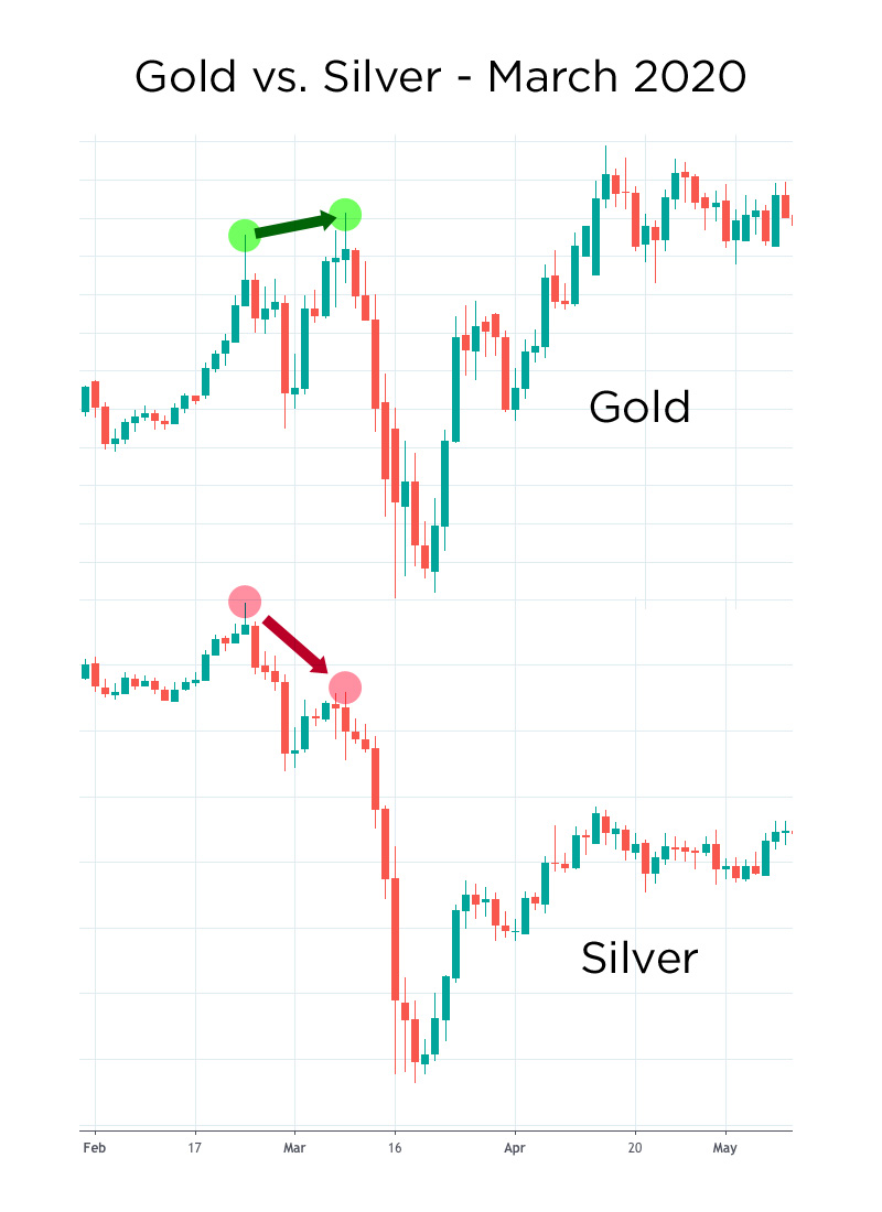 כיצד נדע אם מחיר הזהב עומד להצטרף לשוק המניות ולצנוח, כפי שעשה בחודש מרץ האחרון? ובכן, יתכן שישנה דרך לקבל על כך התראה מוקדמת. אם נשווה את מחיר הכסף למחיר הזהב בימים אשר קדמו למפולת של מרץ, נשים לב שב-9 לחודש מחיר הזהב קבע שיא מקומי חדש, וזאת בשעה שמחיר הכסף נחלש, ונסחר מתחת לשיא הקודם שלו. זה הגיוני, משום שלזהב ישנו תפקיד מוניטרי חשוב בכלכלה העולמית, בשעה שהכסף מהווה כיום בעיקר סחורה תעשייתית. לפיכך הכסף מגיב באופן חזק יותר להתפתחויות שליליות בכלכלה, עקב צפי לירידה בביקוש התעשייתי. אם נראה את הסימן הזה חוזר על עצמו בימים הקרובים, נדע בסבירות גבוהה שגם הזהב עומד לחטוף.