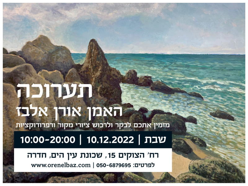 אני רוצה לשוב ולהזמין אתכם לתערוכה אשר אני מקיים בשבת הקרובה, העשירי בדצמבר, בין השעות 10:00-20:00, בבית הורי ברח׳ הצוקים 15, שכונת עין הים בחדרה. כולכם מוזמנים. לפרטים נוספים גשו ל: www.orenelbaz.com