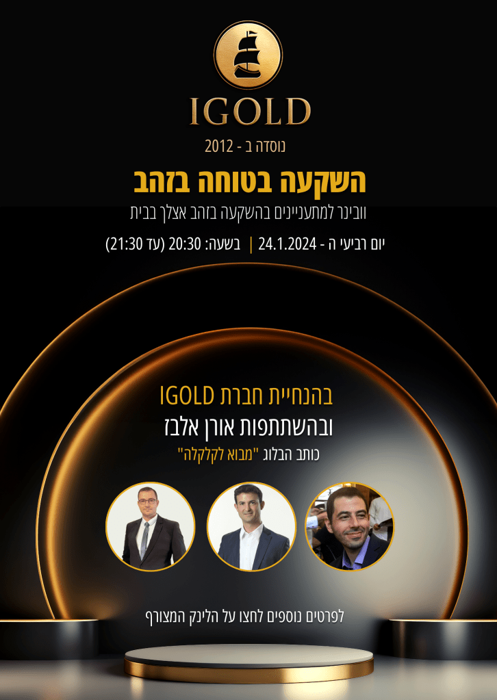 ביום רביעי, ה-24/1/2024, בשעה 20:30, אני מתארח בוובינר של חברת igold, המשווקת מתכות יקרות. במסגרת האירוע אתן סקירה מקיפה על מצב הכלכלה העולמית, ועל הסיבות בגללן אני סבור כי אנו צפויים למשבר כלכלי חסר תקדים. כמו תמיד, אמליץ על חשיפה לזהב פיזי בתור אמצעי ההתגוננות הטוב ביותר.