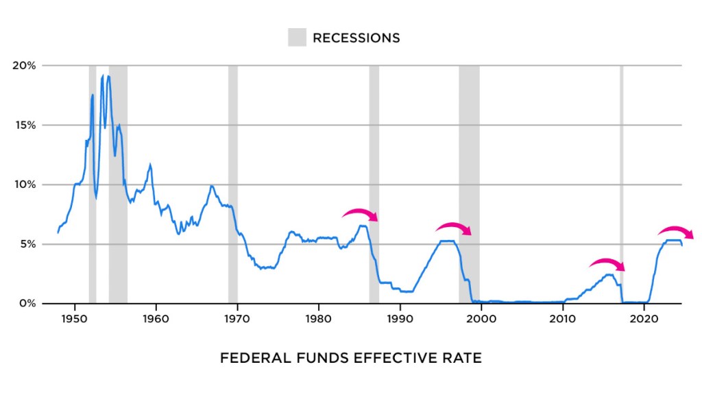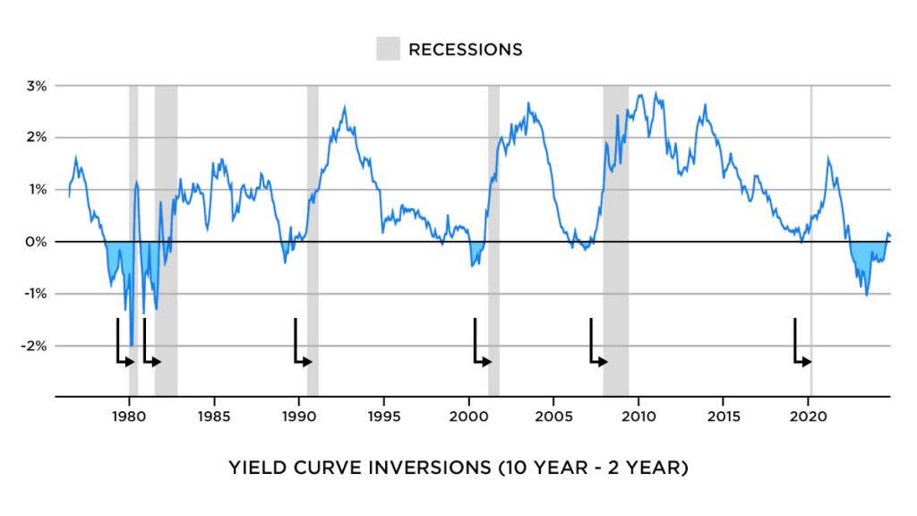 הראיה האחרונה שיש לי עבורכם היא שיעור הריבית של הפדרל רזרב. כפי שניתן לראות מהתרשים, מאז שנת 2000, החלטות הריבית של הפד נעשו הרבה יותר יציבות וצפויות. כל מחזור העלאת ריבית מאז הסתיים בתקופה בה ריבית הבנק המרכזי נשארה קבועה. אך בכל פעם בה הפד הפחית את הריבית בפעם הראשונה, המיתון לא איחר להגיע. כזכור, הבנק המרכזי סיים להעלות את הריבית בקיץ של 2023, ובספטמבר האחרון הפחית אותה ב-50 נקודות בסיס. ככל הנראה, זה היה הצעד הראשון בהחזרת ריבית הפדרל רזרב לאפס, והפעלת מחודשת של מדפסות הכסף.