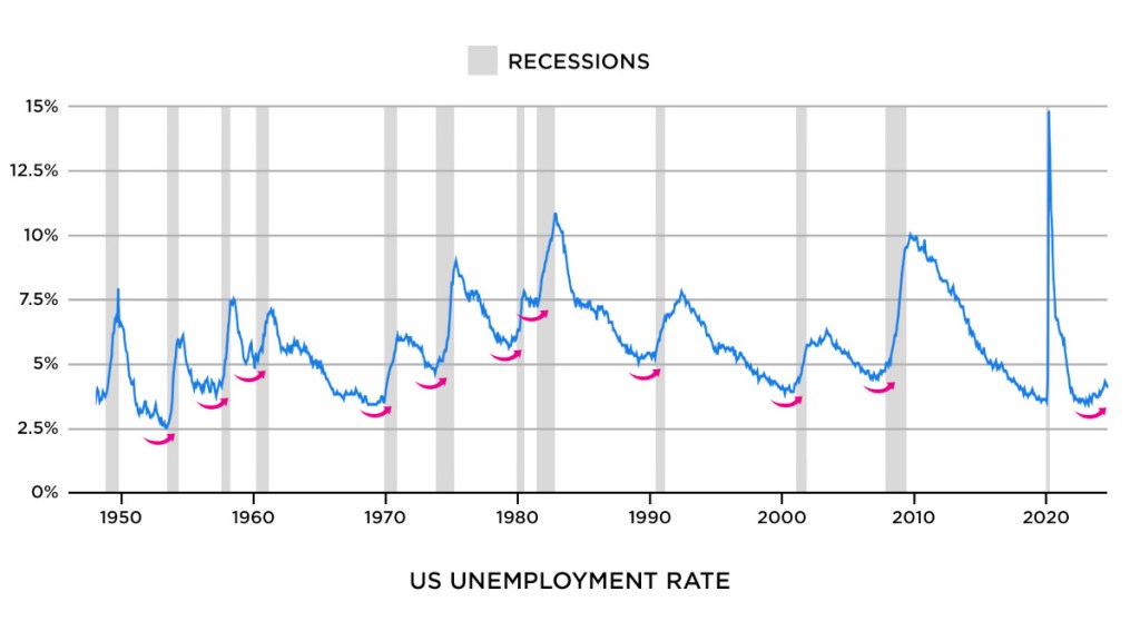 מדד נוסף שאני רוצה להציג בפניכם הוא שיעור האבטלה בארה״ב. כפי שניתן לראות, בתקופות של צמיחה, שיעור האבטלה נוטה לרדת בהדרגה. הוא לעולם אינו מטפס באופן מתמשך, למעט לפני מיתון. ובכן, קצב האבטלה בארצות הברית הגיע לשפל ברבעון הראשון של 2023, ומאז הוא עולה בהדרגה. זוהי סיבה נוספת לחשוד שאנו בדרכנו למיתון. להזכירכם, שיעור האבטלה הוא מדד מאחר. חברות אינן נוטות לפטר בקלות את עובדיהן, ועושות זאת רק כאשר הן נתקלות במשבר חריף. פיטורים המוניים מתרחשים רק לאחר שהמיתון הוכרז באופן רשמי.