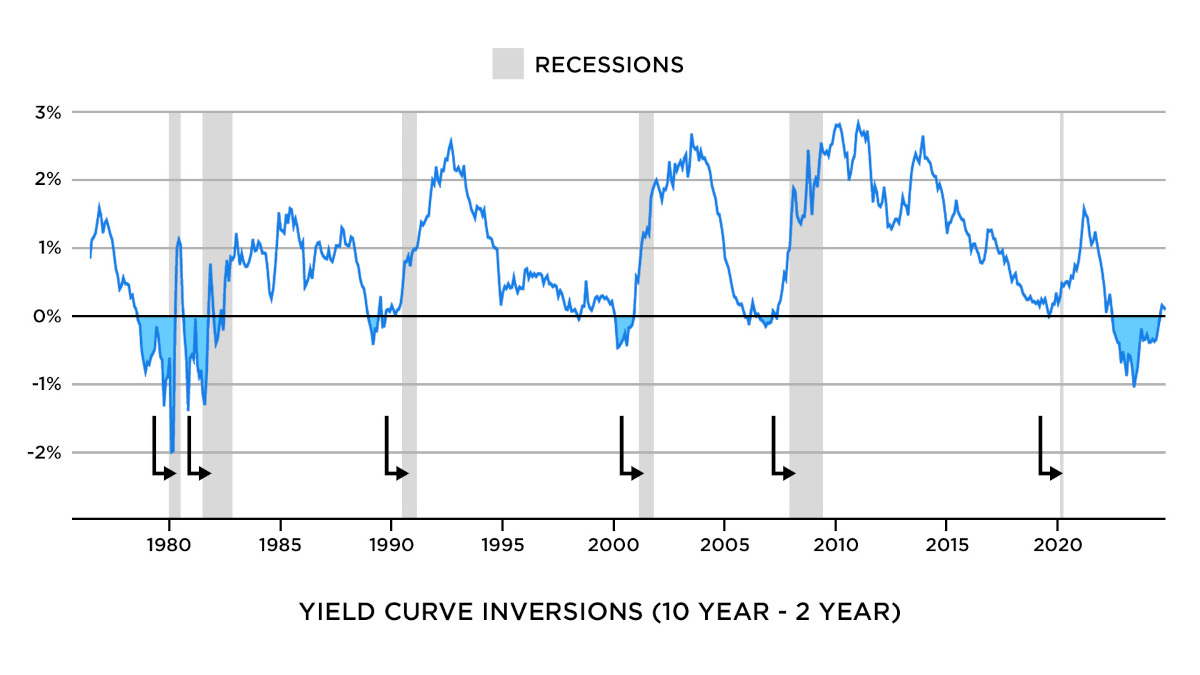 האינדיקטור האמין ביותר למיתון מתקרב מכונה ״עקומת האג״ח״. זהו ההפרש בין תשואת אג"ח ממשלתיות ארוכות טווח וקצרות טווח. כן, אני יודע שזה נשמע מורכב. אך האמינו לי, זה לא. לכל אגרת חוב יש תשואה, שהיא הריבית שניתן להרוויח ממנה. בתנאים נורמליים, אגרות חוב ארוכות טווח אמורות להניב תשואה גבוהה יותר מאגרות חוב קצרות טווח, על מנת לשקף את הסיכון המוגבר הכרוך בהחזקתן. לפיכך הפער בין התשואה של אג"ח של ממשלת ארה״ב לעשר שנים ולשנתיים אמור להיות חיובי. אבל כפי שניתן לראות מן הגרף, מדי פעם מדד זה הופך להיות שלילי. אנו מכנים זאת "היפוך של עקומת האג״ח״, ומסיבות שאינן מובנות לחלוטין, זהו האינדיקטור האמין ביותר למיתון מתקרב. כפי שניתן לראות, מאז שנות ה-80 כל היפוך של עקומת האג״ח הוביל למיתון.