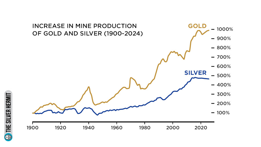 יש להדגיש שהשימוש בציוד כרייה מודרני לא הפך את הכסף לנפוץ יותר בהשוואה לזהב. להפך, מאז שנת 1900, תפוקת הזהב השנתית גדלה בערך פי עשרה, בעוד שתפוקת הכסף השנתית גדלה רק פי חמישה. במהלך ארבע השנים האחרונות, אנו עדים לגרעון מתמשך בכסף פיזי, מה שמוכיח שהביקוש עולה על ההיצע. לכן, היחס הגבוה בין מחיר הזהב והכסף אינו נובע מעודף היצע של כסף. ככל הנראה, זוהי תוצאה של שוק שאינו רגיש למחיר, ולפיכך חשוף למניפולציות מחירים. אני טוען שמבנה שוק ייחודי זה נוצל על ידי גופים פיננסיים חזקים, על מנת לגרוף רווחים עצומים, ואולי גם כדי לשמור את הכסף זול באופן מלאכותי עבור לקוחותיהם, הן במגזר הפרטי והן במגזר הציבורי.